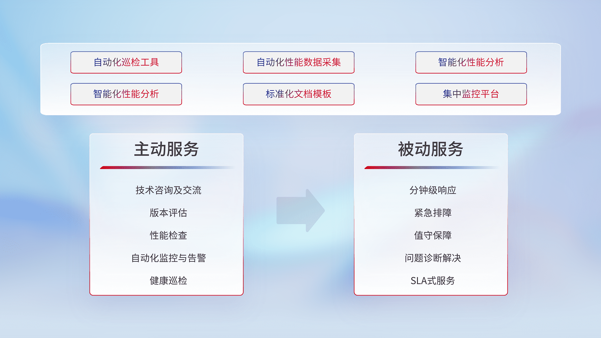 智能化工具和标准化文档,,保障服务质量,,,,提供主动服务(包含技术咨询、、、、版本评估、、、、性能检查、、自动化监控与告警、、、、健康巡检)和被动服务包含(分钟级响应、、、紧急排障、、、、值守保障、、、问题诊断解决、、、SLA服务)。。